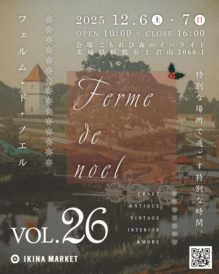 12/6(土)、7(日)は茨城県稲敷市にて「フェルム・ド・ノエルVol.26」に出店します Published 2025-11-19 by 鎌倉木貨 12/6(土)、7(日)は茨城県稲敷市にて「フェルム・ド・ノエルVol.26」に出店します 以前より色んな作家さんから「素晴らしい」と評判を伺… Continue reading12/6(土)、7(日)は茨城県稲敷市にて「フェルム・ド・ノエルVol.26」に出店します Leave a Comment