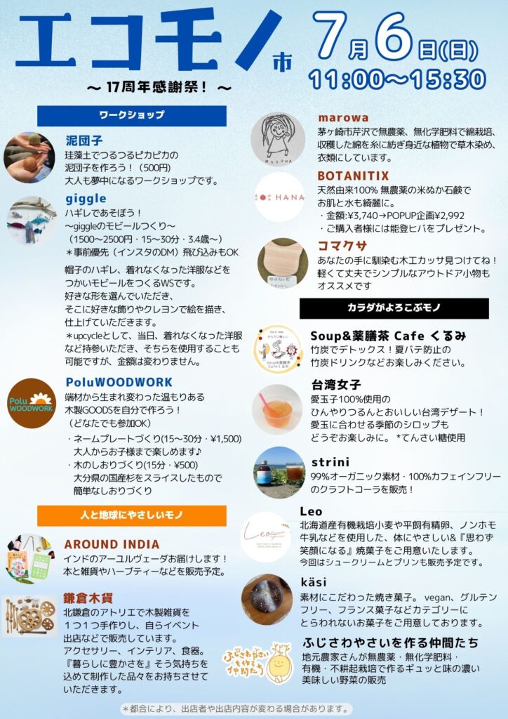 藤沢市の国道1号線沿いにあるecomoさんにて、「エコモノ市」に出店させていただきます